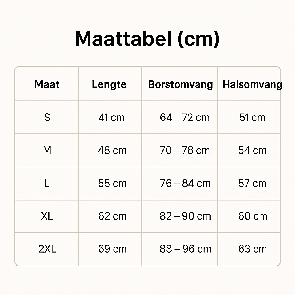 - Maten: S, M, L, XL, 2XL (zonder trekkoord).